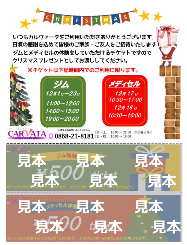 2022年12月のご招待チケットについて 2022年12月ご招待チケット カルヴァータに通っている会員様に、体験チケットをお配りしています♪ 会員様のご家族・ご友人の方をご招待いたします。 当日はチケット裏面をご記入の上・ご持参をお願いいたしま... 2022.11.28 お知らせ