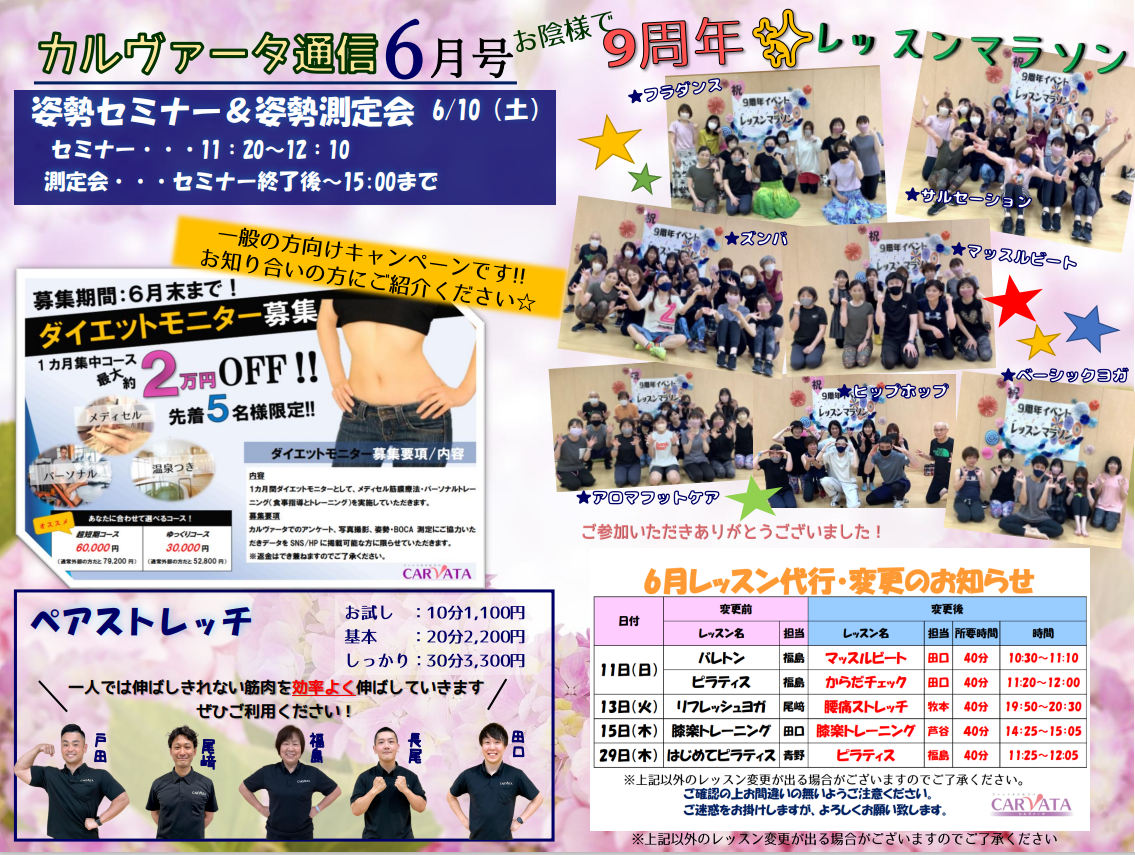 おかげ様で10周年☆カルヴァータありがとうキャンペーン2024年6月 おかげ様でカルヴァータは10周年を迎えることができました! 皆様に楽しんでいただけるイベントをご用意してます♪ カルヴァータで運動を始めたい方は6月がラストチャンスです!お見逃しなく! 10周年チラシPDF... 2024.4.1 お知らせイベント