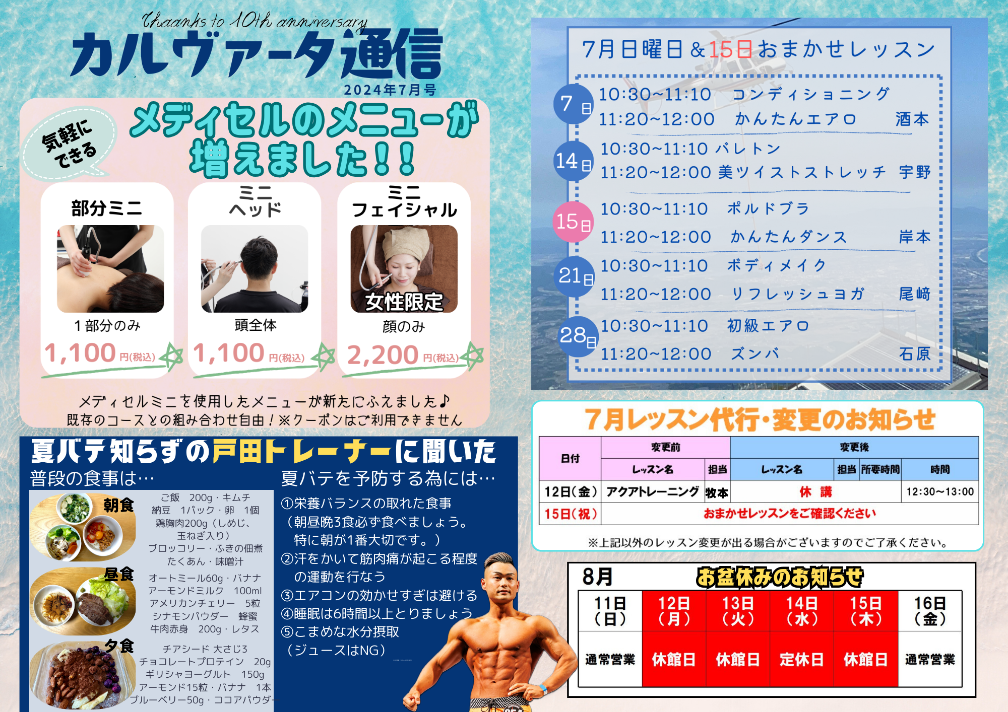 カルヴァータ通信2024年7月号が完成しました! カルヴァータ通信2024年7月号が完成しました! 夏バテ知らずな戸田トレーナーの普段の食事も掲載しているので、ぜひ参考に! 2024.6.22 お知らせ