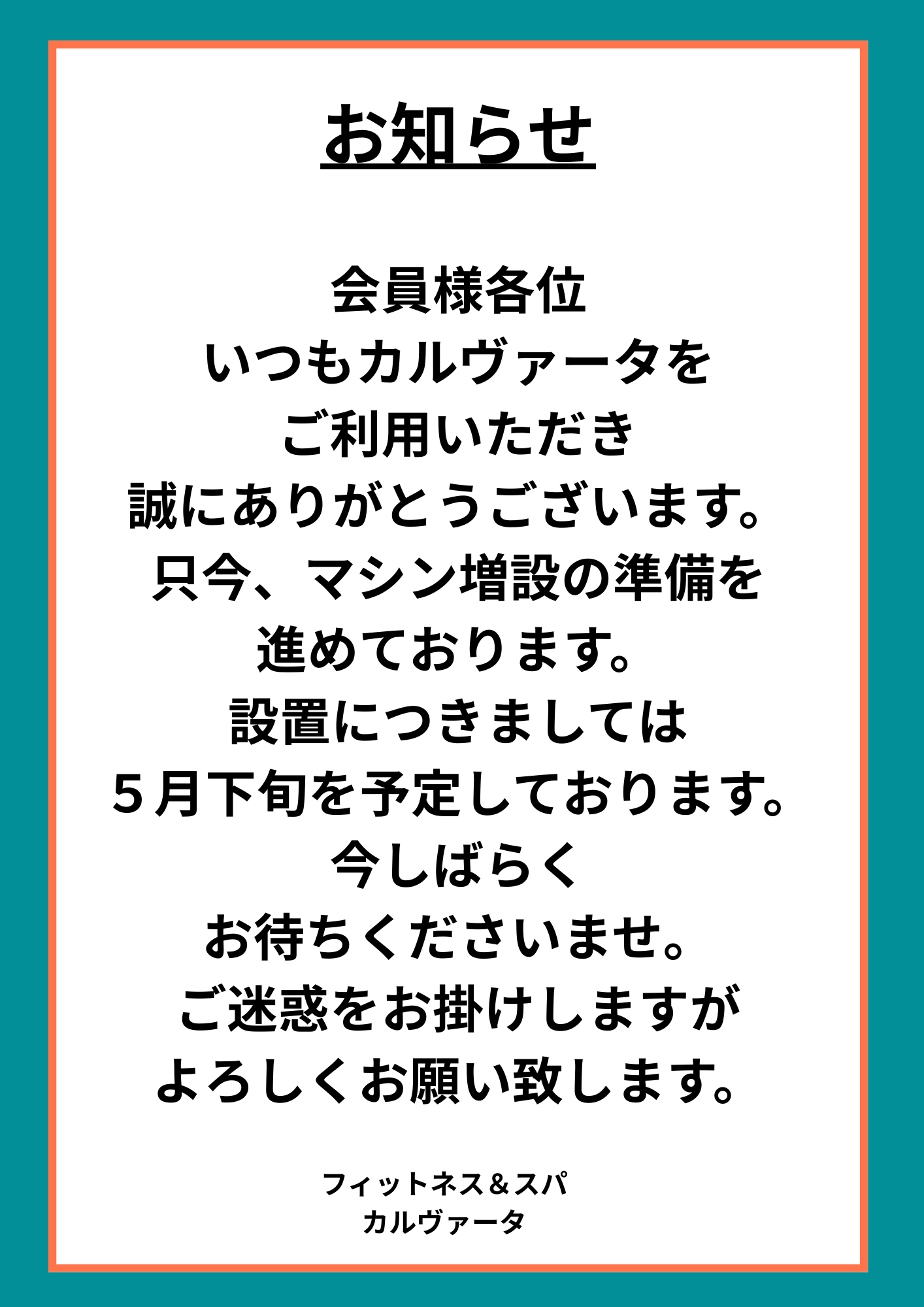 男性ロッカー内のトイレ使用禁止のお知らせ いつもカルヴァータをご利用いただきありがとうございます。 1階男性ロッカー内のトイレが修理の為2025年4月2日(水)より使用禁止となります。 ご不便をお掛けしますが、何卒よろしくお願いいたします。 2025.4.4 お知らせ